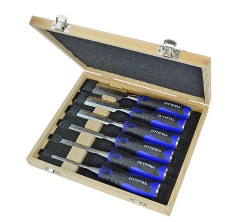 All chisels are supplied with blade guards and presented in a hinged wooden storage case.