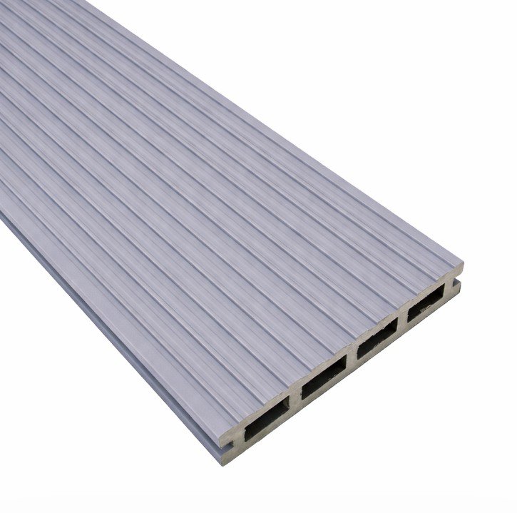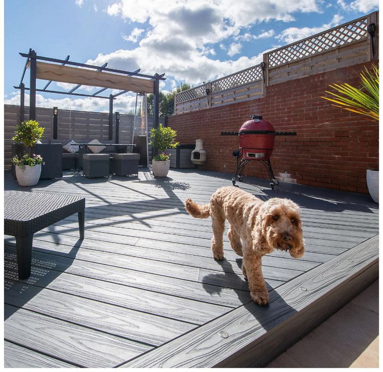 Grey Composite Decking Board, Habitat+ is reversible, one side has a woodgrain effect the other has a grooved finish. Use only the recommended Habitat fixings for installation (starter clips, hidden fixings and screws).